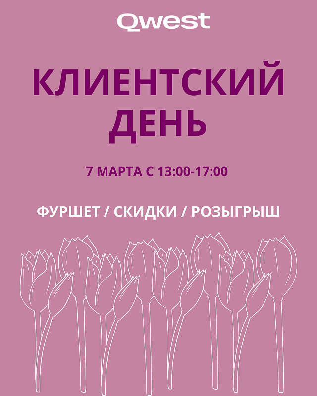 - Предпраздничный День Клиента в магазине QWEST 7 марта с 13:00 до 17:00! Подарки, фуршет, настроение весны и модные новинки!